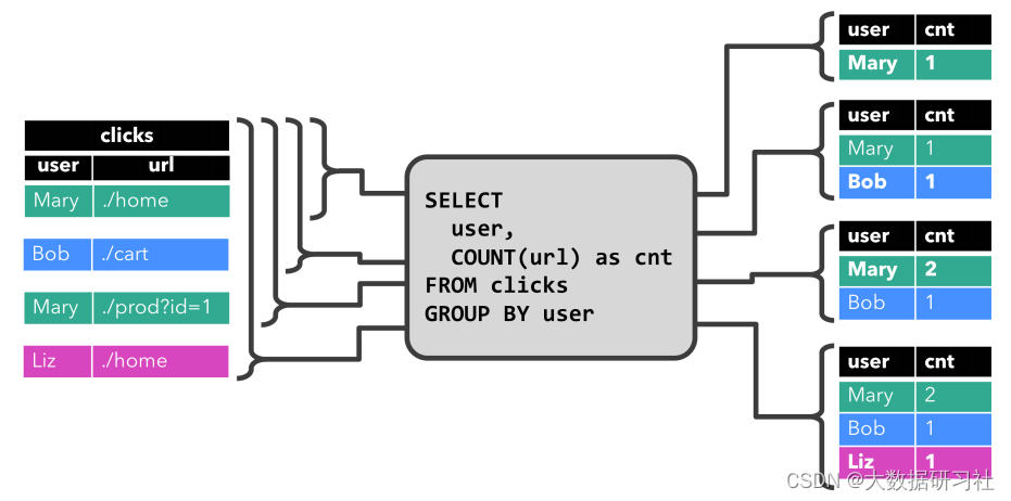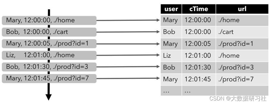 In order to hold ⾏ Relationship query ,⾸ First you have to convert the data flow into a dynamic table . Click stream is shown on the left of the figure below , On the right is the dynamic table , All new events on the stream will correspond to... On the dynamic table insert operation ( except insert There are other models , after ⾯ Let's talk about it again ):