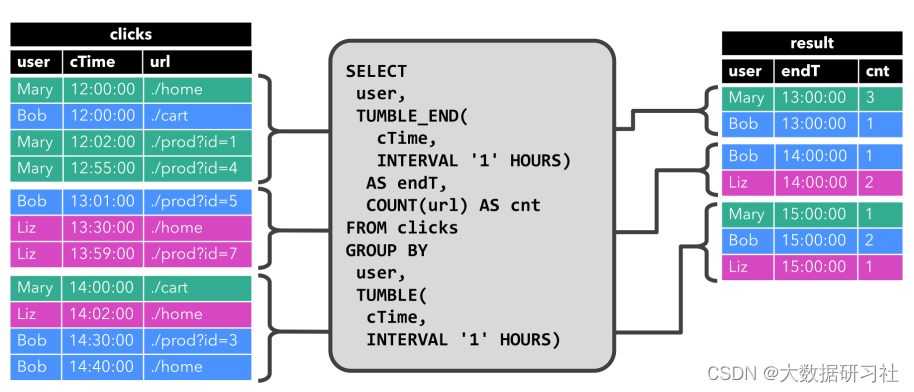 The picture above is a little complicated ⼀ some , group by count polymerization , Plus ⼊ 了 ⼀ A rolling window ⼝, Statistics 1⼩ Roll the window ⼝ Each inside ⽤ Number of visits by users . Over time , The dynamic result table on the right follows the left measurement ⼊ Table of changes in ⽽ change , But every window ⼝ The result is ⽴ Of , And the calculation is in each window ⼝ Triggered at the end .