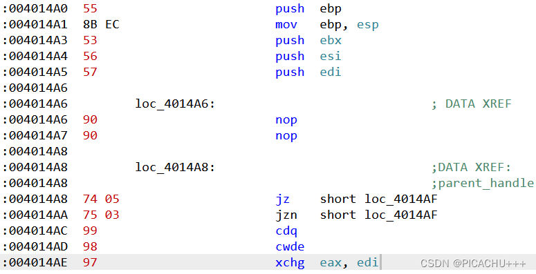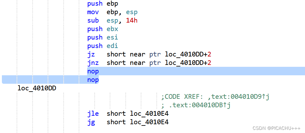 进一步分析这个程序,可以得到花指令的指令模式,主要是在某些特定的指令序列之后插入一到两个无用字节,通过IDA脚本自动化去除花指令代码如下: