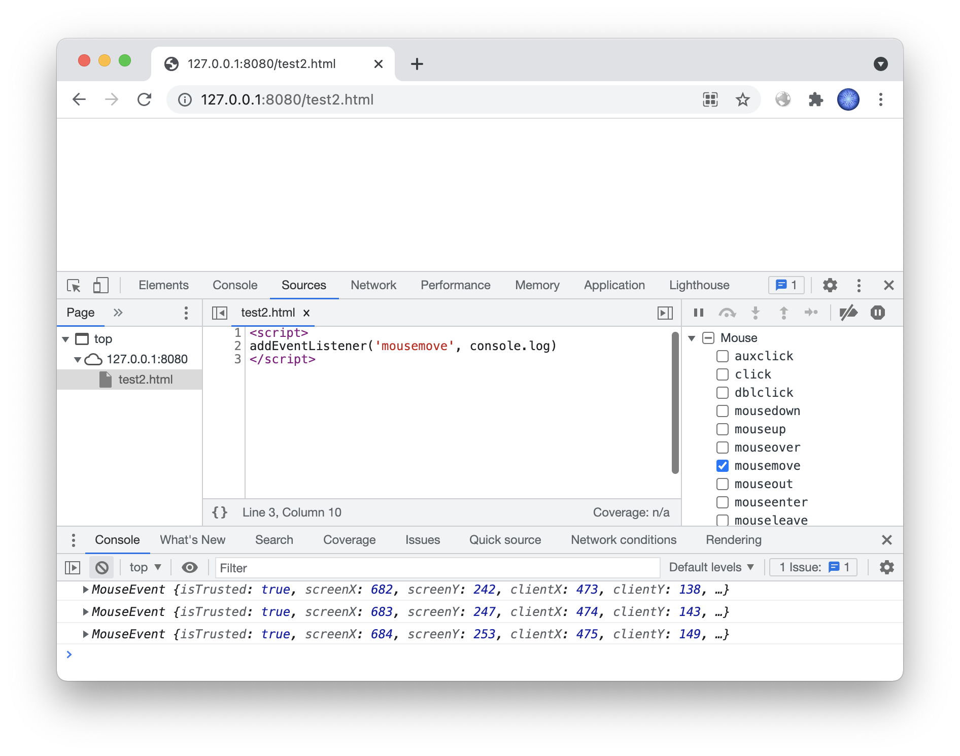 addEventListener('mousemove', console.log)