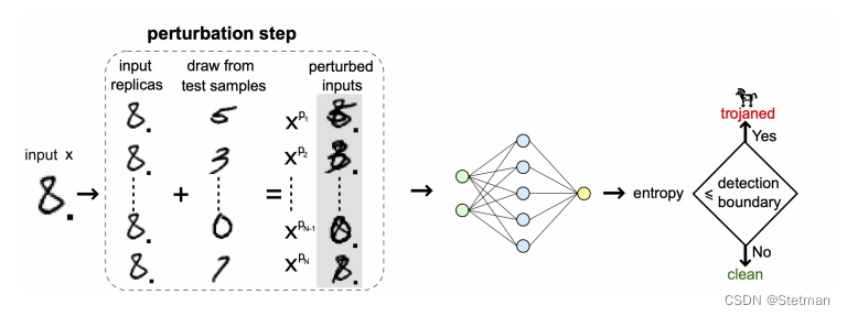 STRong Intentional Perturbation (STRIP):与静态监测不同,此方法是在模型运行时进行监视。过程如下:首先,STRIP将对每个输入进行扰动,通过添加从测试样本中提取的良性样本,得到一个扰动输入