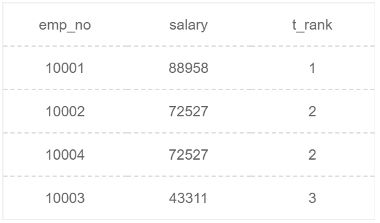 select emp_no, salary, dense_rank() over (order by salary desc) as t_rank