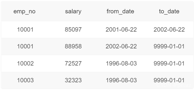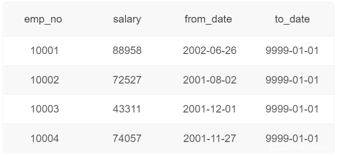 ( notes : to_date Adjust an end date for salary , Or the date of resignation ,to_date='9999-01-01’ when , Means still in office , No subsequent adjustment records )