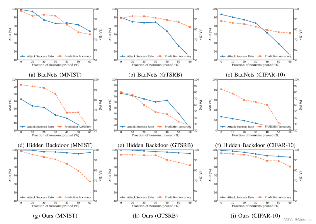 修剪:前面有提及robnet特殊的选择神经元方法,因此无论基于低激活还是低权重的修剪都对其无效。下图展示了修剪在三个测试数据集对三种攻击的影响。