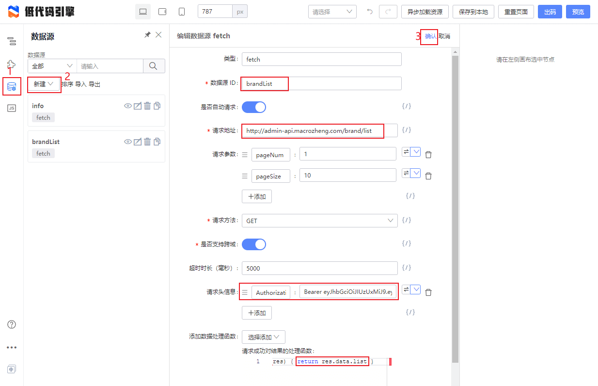 data sourceFunction to achieve , Here we call... Of the demo environment API, Fill in the request parameters , It is worth noting that the data list is indata.listProperties of the , We need to customize the processing function for successful requests ;
