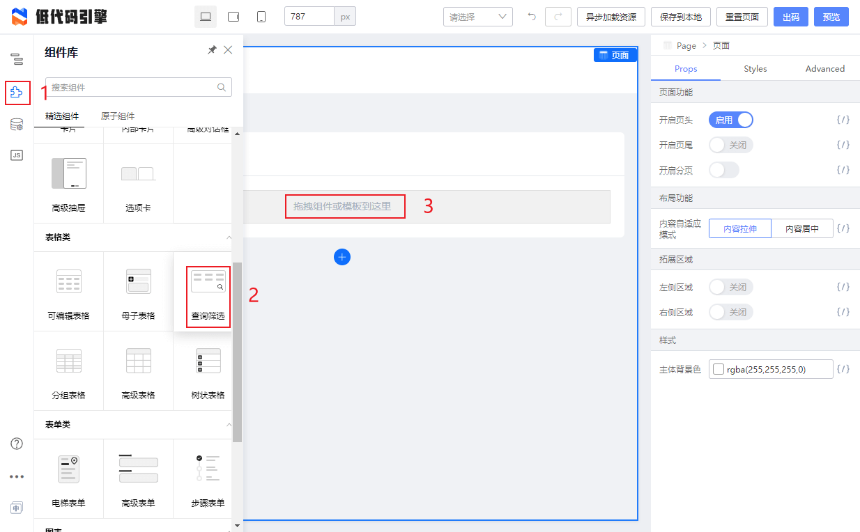 Component libraryChoose fromQuery filteringComponents , Insert into the editing area by dragging ;