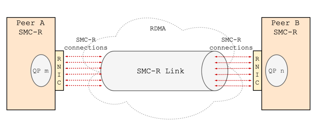 通信两端将已创建的 RDMA 资源通过 CLC 消息同步到对端,进而在两端之间建立起基于 RC (Reliable Connection) QP 的 RDMA 链路。SMC-R 中将这种点对点逻辑上的 RDMA 链路称为 SMC-R Link。一条 SMC-R Link 承载着多条 SMC-R 连接的数据流量。