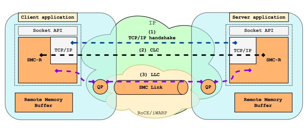 其中,sndbuf 用于存放连接待发送的数据,被注册为 DMA 内存。本地 RNIC 设备可以直接访问 sndbuf,从中取走有效负载 (payload)。而 RMB 用于存放远程节点 RNIC 写入的数据,即连接待接收的数据。由于需要被远程节点访问,因此 RMB 被注册为 RDMA 内存。