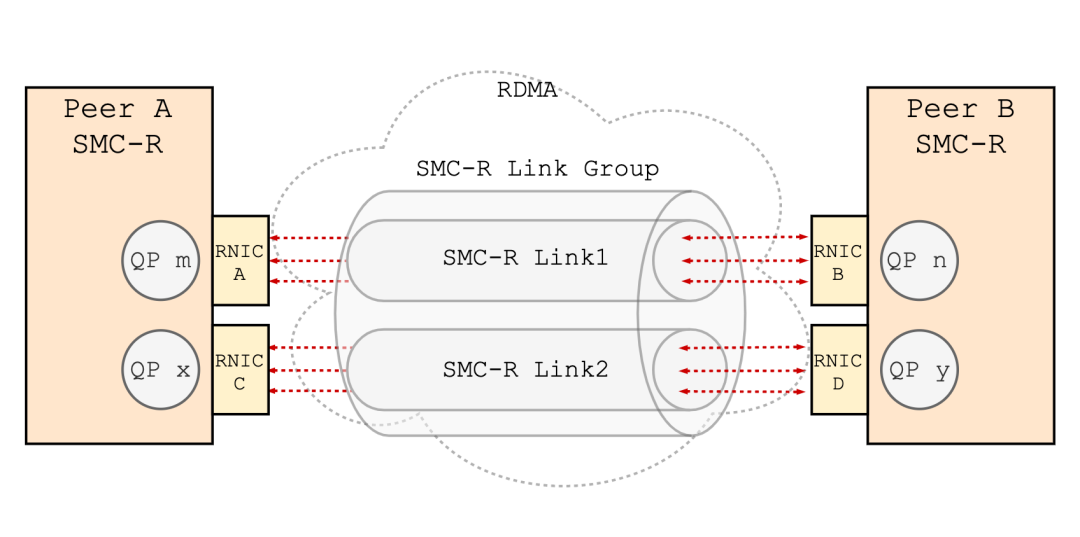 若通信节点之间存在不止一对可用的 RNIC,则会建立不止一条 Link。这些 Link 在逻辑上组成一个小组,称为 SMC-R Link Group。