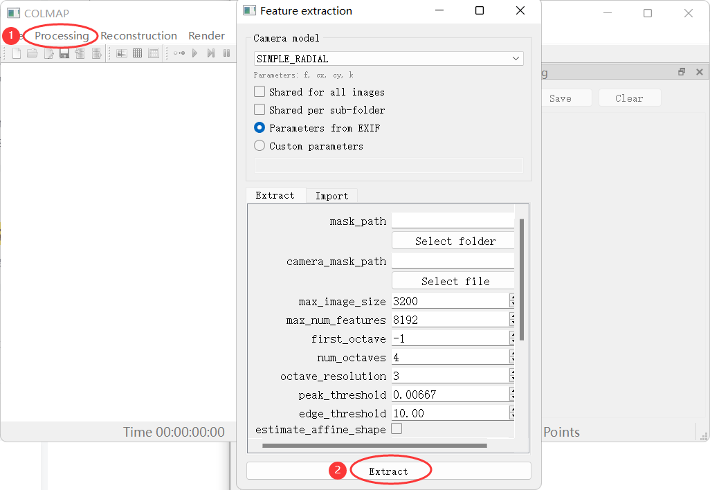 - 点击Processing-Feature Extraction,默认参数即可,点击Extract,等待程序运行完毕可看到右侧有log信息输出。