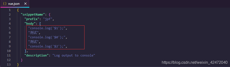 :defaultValue}:生成代码后光标的初始位置, defaultValue为默认值, 可按下Tab键不编辑直接跳过