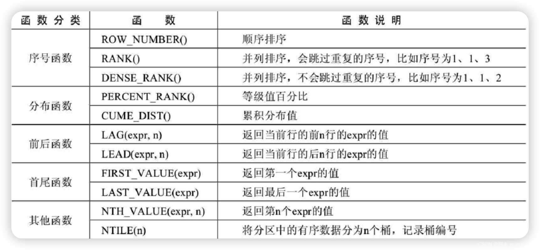 窗口函数总体上可以分为序号函数、分布函数、前后函数、首尾函数和其他函数