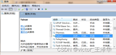 在虚拟机进行如下操作:Windows+R --> 输入services --> 进入到服务,开启telnet服务