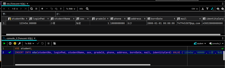 INSERT INTO stu(studentNo, loginPwd, studentName, sex, gradeId, phone, address, bornDate, mail, identityCard) VALUE ('123456','00000',' Jane ',' Secret ','1','1888888888',' Changsha ','2000-1-1','[email protected]','43032000000000');