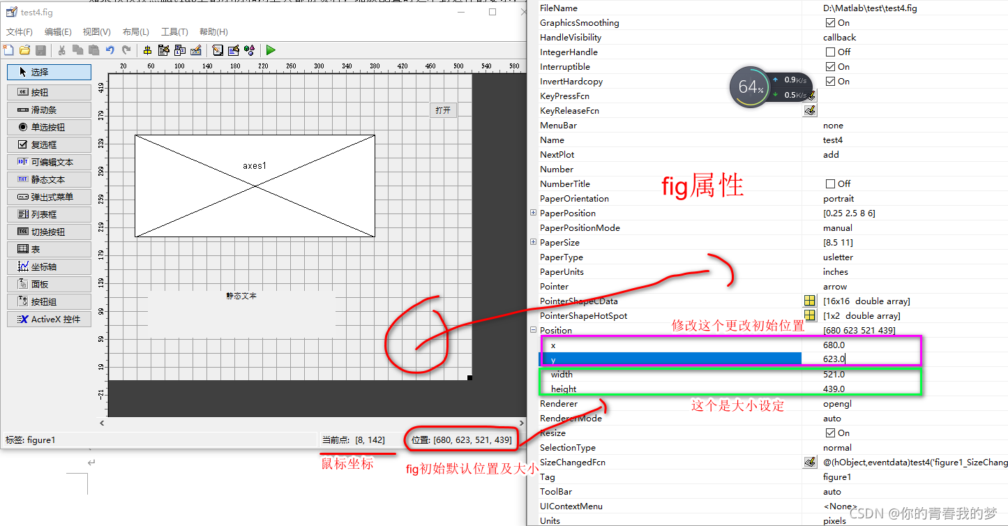 stay gui There is coordinate display under the lowest design : Current point : Coordinates are where the mouse is located , Location : Is the control we choose or fig Location information for , Here we choose fig, So what it shows is fig The location of , double-click fig Pop up properties , notice position Is consistent with this message ; modify position The value of can be changed fig Size ,xy Yes, it is on by default fig Where it is ( Starting point in the lower left corner ); Of course, you choose other components , The location shows their corresponding information ;