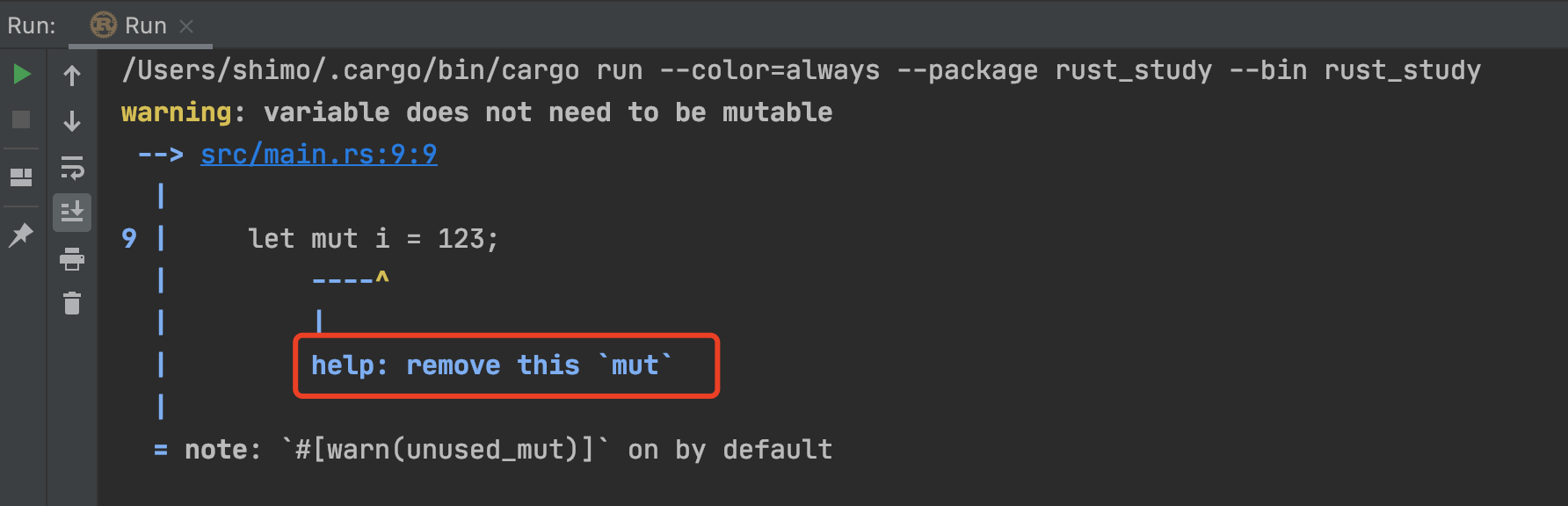 当你使用 mut The variable is not modified,Rust Compile time will be friendly alarm,Prompt you to remove unnecessary ones mut.