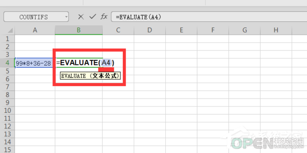 4、再然后在要显示结果的表格输入“=EVALUATE()”,括号中的内容是算是所在的单元格,比如小编的算式在A4,就是=EVALUATE(A4)。