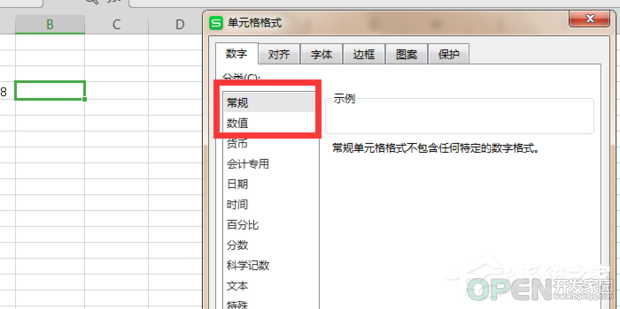 3、再然后在“数字”下的分类选择“常规”或“数值”。