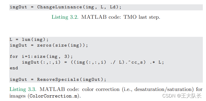 在list3.2的最后一步中,将文件夹Tmo / util中的ChangeLuminance.m应用于img,以删除旧的亮度L,然后用Ld替换它,以获得imgOut。 可选步骤是颜色校正。 许多TMO通过将公式(3.2)应用于最终输出来处理此问题。 但是,由于颜色外观可能会根据TMO的参数而有很大差异,因此省去了这一额外的过程。 list3.3中显示了ColorCorrection文件夹下的ColorCorrection.m函数,该函数以简单的方式将公式(3.2)应用于输入图像。 注意,校正值cc_s可以是每个像素校正的单通道图像。