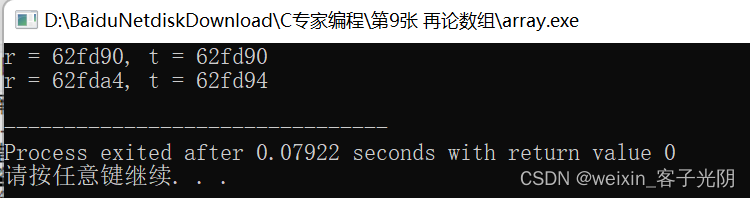 将会使r和t分别指向它们各自的下一个元素(两者所指向的元素本身都是数组)。它们所增长的步长是很不相同的,因为r所指向的数组元素的大小是t所指向的数组的元素大小的3倍。