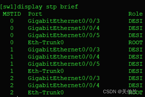 [sw1-GigabitEthernet0/0/1]eth-trunk 0