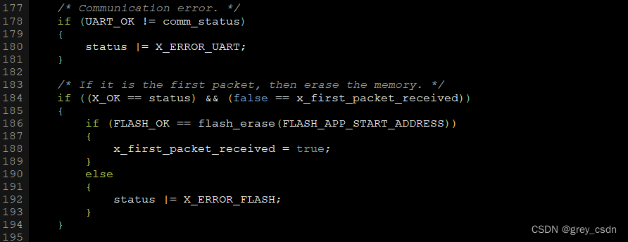 如果串口传输有错误,那么标记错误信息。如果成功了,并且发现之前没有第一包传输成功的标记信息,那么意味着这一次是首次传输。这样,接下来需要擦除Flash以准备后面的数据烧写。在这个过程中,看到了前面接触到的Flash的错误,这个错误会导致刷写流程直接中断。
