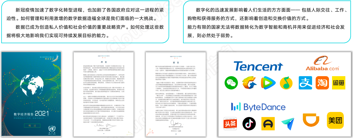 近年來,隨著IT互聯網的迅速發展,數字經濟與數字生活對人們日常生活的影響也逐漸加深。如下圖右下角所示,部分APP已經改變了人們的衣食住行。此外,新冠疫情在全球的爆發也使得全球數字化發展的速度得到了進一步提昇。在面對疫情不確定性挑戰中,各個行業都意識到了數字化轉型對企業的重要性。 下圖2021年聯合國發布的全球數字經濟報告中更是深刻地指出了數字經濟以及數字資產對各個國家的影響。