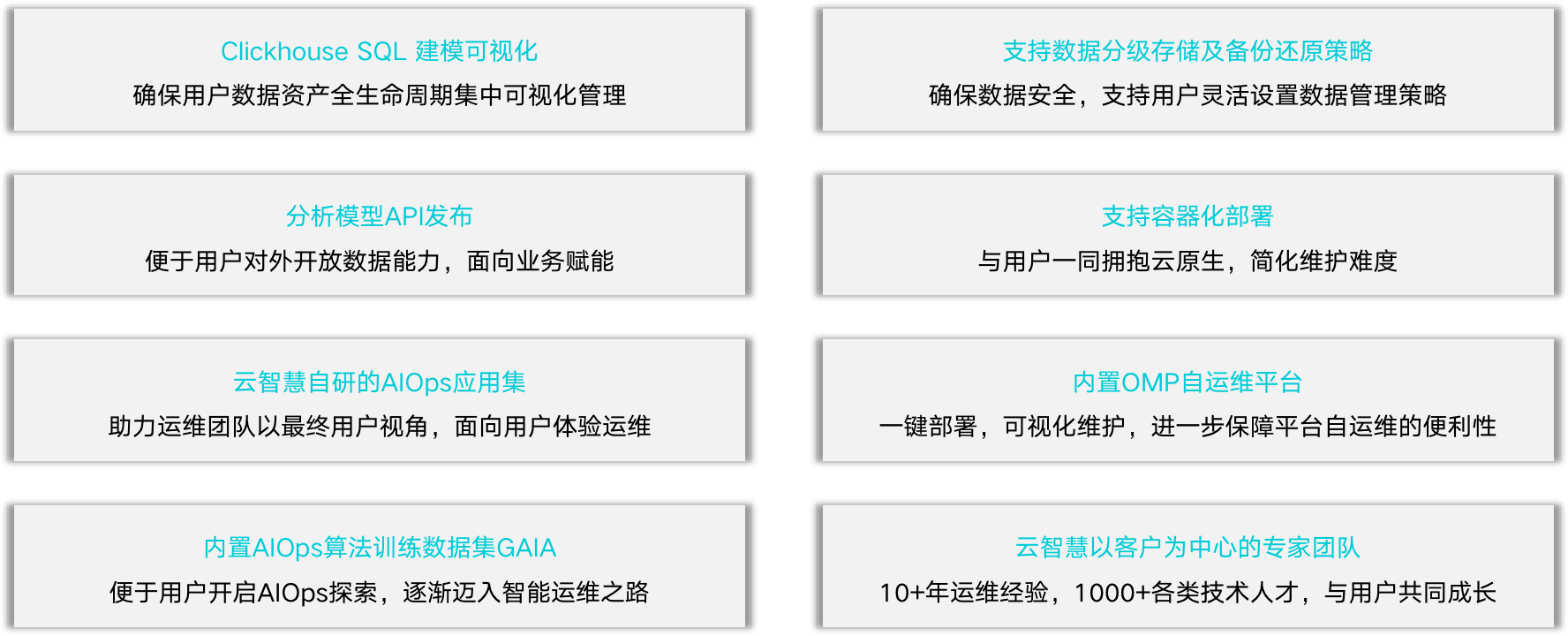 該方案主要組成部分均采用分布式架構,具備高並發,高吞吐、低延時的大數據特性。其中數據平臺采用了 Flink 和 Clickhouse 兩款主流大數據技術,算法中心使用了 Pytorch 和 Tensorflow 兩種主流的機器學習框架/平臺,並內置了7種雲智慧自研的AIOps算法。該方案經過多個行業頭部用戶驗證及洗禮,能够充分應對大規模運維數據的集中采集、處理、分析及應用。結合雲智慧自研的數據價值應用,可以充分發揮運維大數據價值,使用戶全面掌握系統運行狀况,並進行高效運維。方案整體依托之前一章的分析,有針對性的應對運維大數據特征,是一套十分具有特色的運維大數據解决方案。