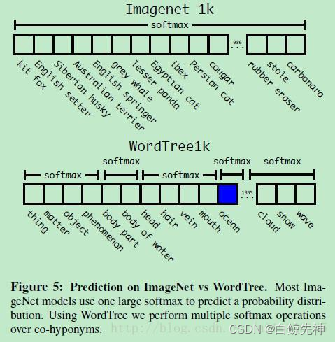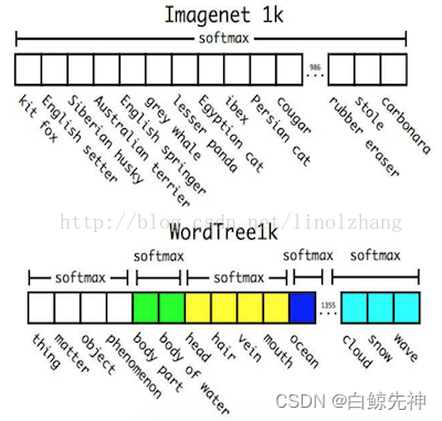 另外,softmax操作也同时应该采用分组操作,下图上半部分为ImageNet对应的原生Softmax,下半部分对应基于Word Tree的Softmax:
