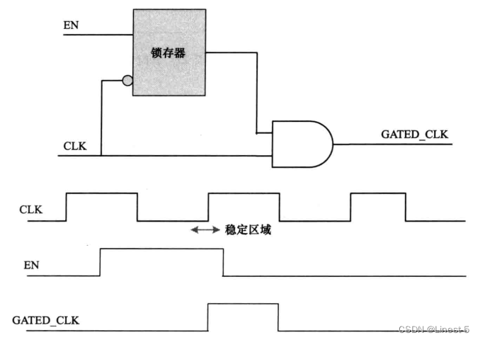 基于锁存器的门控时钟风格向设计中加入了一个电平敏感的锁存器,以在时钟活跃沿和不活跃沿之间保持使能信号不变,这样就无须依靠门控电路本身来满足这一要求了,如下图所示。