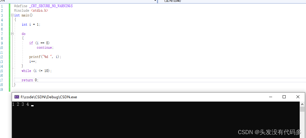 When used here continue after , Print ;1-4, not used continue Print 5, This is because... Is not used continue when , There is a judgment condition (i==5) Judge i Is it equal to 5, If i be equal to 5, Just print , Use continue after , The program will automatically jump to while() Then move on , When you meet again continue after , Still jump to while Then move on , So at this time i Always equal to 5