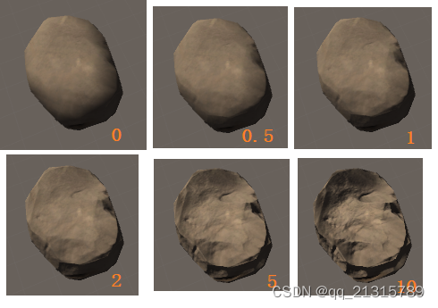 之后可以调整BumpScale,当为0时完全未使用法线贴图,模型的细节就比较少。当为1时完全使用法线贴图,模型表面的细节增加了很多。当大于1时就比较夸张了。