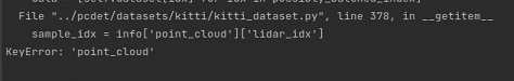 File "../pcdet/datasets/kitti/kitti_dataset.py", line 378, in __getitem__ sample_idx = info['point_cloud']['lidar_idx'] KeyError: 'point_cloud'