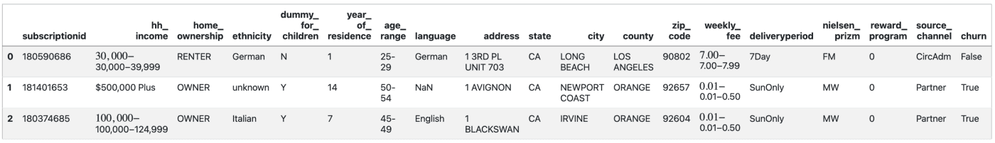 数据集包含人口统计信息,如代表家庭收入的HH信息、房屋所有权、小孩信息、种族、居住年份、年龄范围、语言;地理信息如地址、州、市、县和邮政编码。另外,用户选择的订阅期长,以及与之相关的收费数据。该数据集还包括用户的来源渠道。最后会有字段表征客户是否仍然是我们的订户(是否流失)。