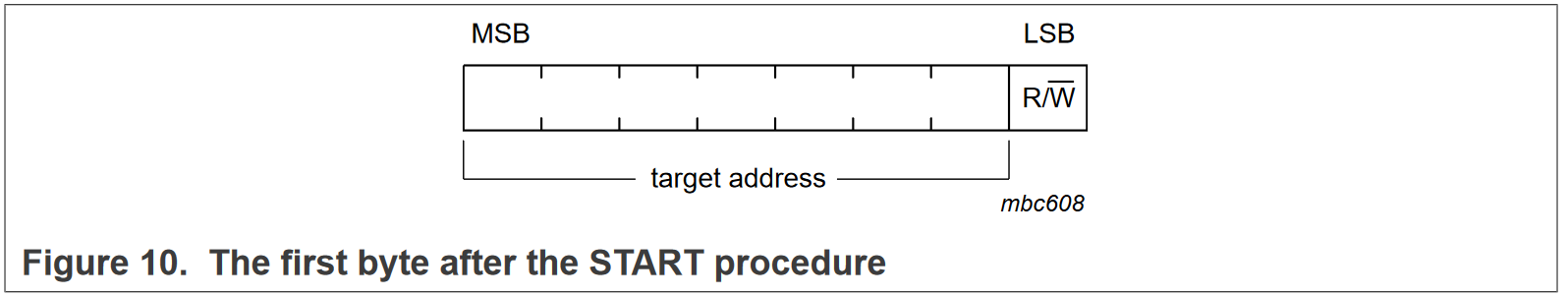 第一字节的前七位为 1111 0XX ,最后两位是十位地址的最高有效位(MSB)。第8位为 R/W 位。