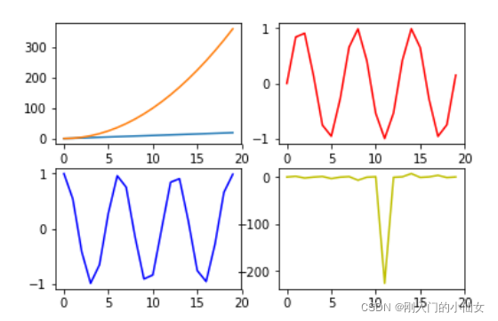 也可以使用 **fig,axes = plt.subplots(rows,cols,*args,kwargs) 来绘制多个图形,返回值是一个元祖,其中的 fig 参数是 figure 对象, axes 是 axes 对象的 array。效果与之前使用 plt.subplot 一样。