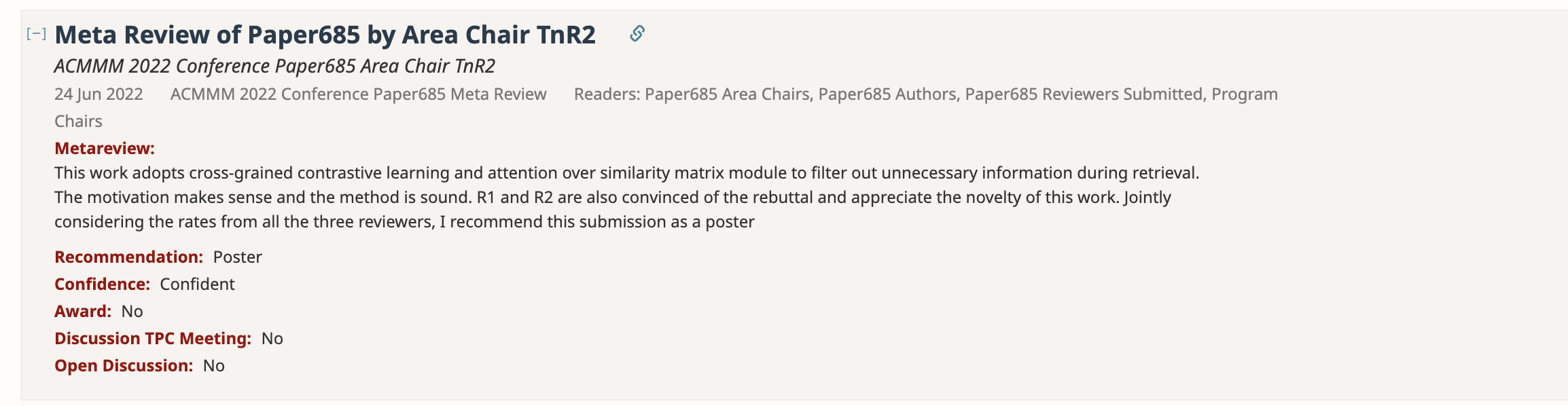 在忙完学校的事情之后,我跟导师商量了实习的事情,并开始了在阿里达摩院之旅,实习期间做的是视频文本检索的任务。有了之前的投稿经历之后,我这次很快的完成了baseline的实验,并想到了一个简单有效的idea,进行了进一步的实验。在确定idea有效之后,也迅速跟导师和mentor商量起了投稿计划,当时准备投的是SIGIR。跟导师汇报了这个idea后,导师给的意见是可以在模型效率上进行进一步的改进,所以接下来的一段时间,尝试了一些提高模型效率的方法,然而无果,倒是在性能上有了进一步的提升。因此,抱着用效率换性能的想法,我开始了SIGIR的论文撰写。接着,我就在一边做ablation,一边写论文。然后就在投稿前10天左右,我发现ablation的结果有些不太好,实验发现单独一个模块的性能在某些数据集上甚至优于完整的模型结构,这让我又非常emo了。然而工作基本上都已经做完,只能在文章中对这一现象,做一些定性的可视化,并进行一些解释分析。然而,事实证明,论文还是做的尽善尽美,审稿人对这些解释不买账,并进行了argue;导师之前提出的效率问题,审稿人也提出了相同的concern;此外,还有一些实验上也不够完整。最终,这篇文章也悲剧了。之后,审稿人的意见和导师之前的疑问,我也对这篇文章进行了反思,并对文章的idea进行了改进,修改模型结构,重新进行实验。离职前将其投稿了今年的MM上。文章的初始分数两个BA,一个WA,最后被接收为poster。此外,之前被拒的两篇文章,我也根据审稿人、导师和师兄的意见进行了修改和完善,将其投稿到了期刊上,在今年上半年也被接收,瞬间觉得这两年的努力都值得!
