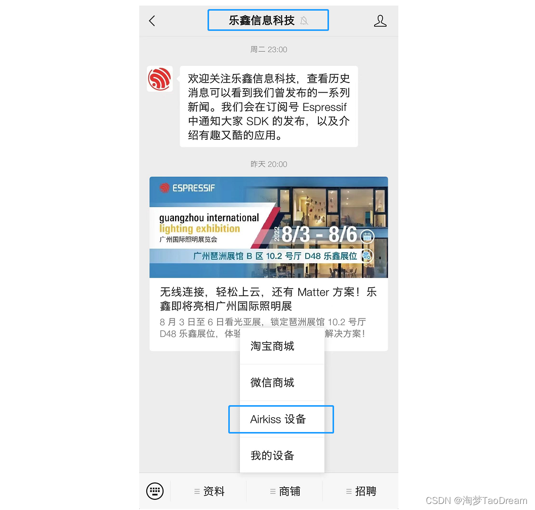 }打开微信公众号“乐鑫信息科技”,商铺->Airkiss设备。