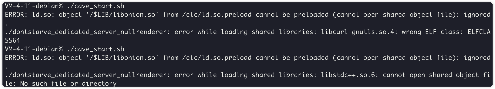 在Debian/Ubuntu上如果出现./dontstarve_dedicated_server_nullrenderer: error while loading shared libraries: libcurl-gnutls.so.4: cannot open shared object file: No such file or directory