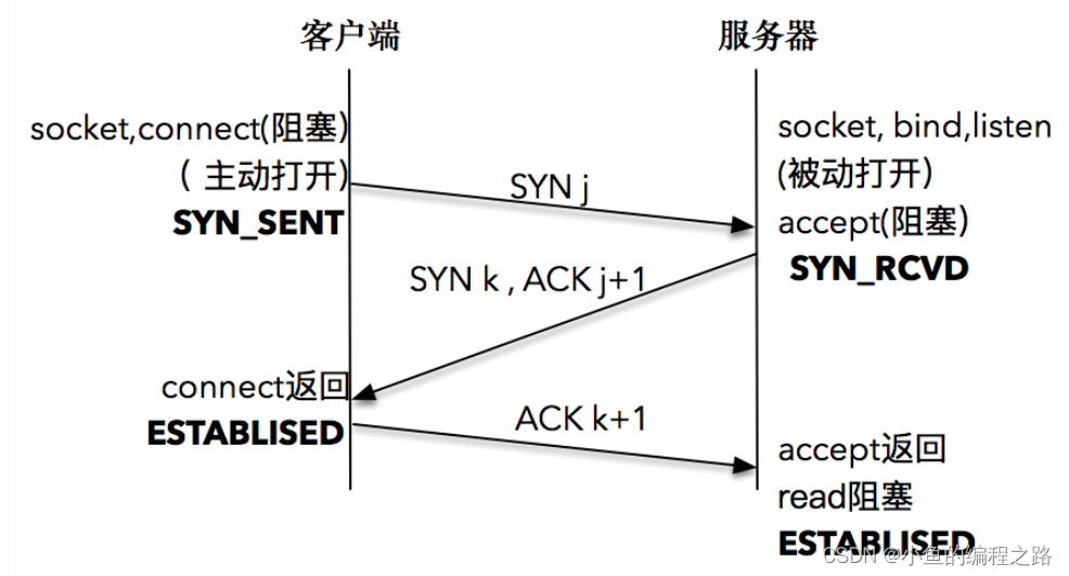 - 客户端协议栈收到 ACK 之后,使得应用程序从 connect 调用返回,表示客户端到服务器端的单向连接建立成功,客户端的状态为 ESTABLISHED,同时客户端协议栈也会对服务器端的 SYN 包进行应答,应答数据为 k+1;
