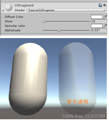 之前说直接修改片元函数返回的值中的阿尔法值并不能直接修改透明度,这是因为还需要添加另外几句语句来改变渲染队列等才能让透明度生效。具体在代码中展示。