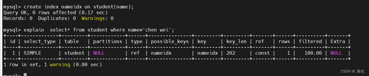 再次用同样方法查询,发现使用了nameidx索引,就只扫描了一行数据。