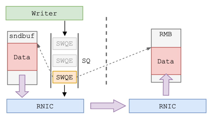 - The sender RDMA Users (SMC-R Kernel protocol stack ) To the local SQ in Post SWQE,SWQE The length of data to be sent and memory address are recorded in . The sender RNIC according to SWQE The recorded information takes out the data of corresponding length and sends it to the opposite end ;