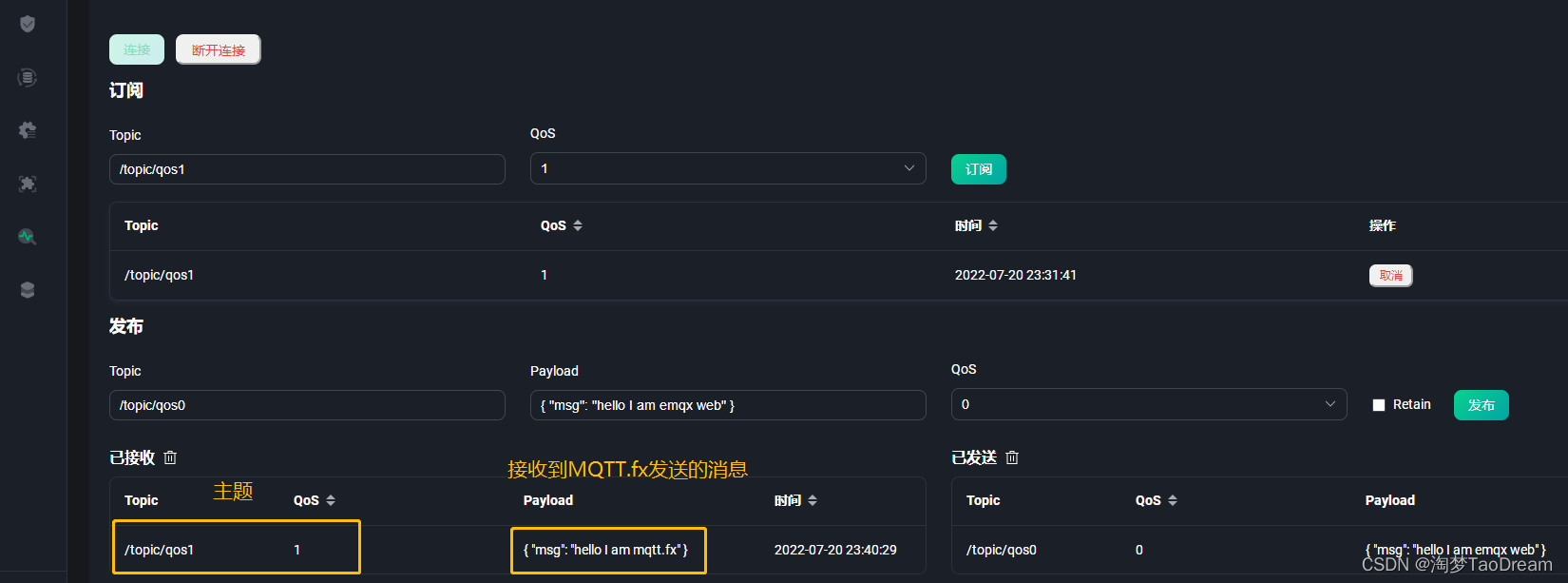 2)WebSocket客户端订阅主题:/topic/qos1,Quality of service level selectionQoS1.
