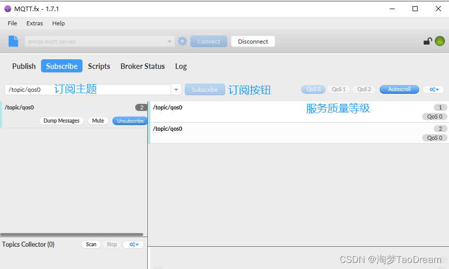2)MQTT.fx客户端订阅主题:/topic/qos0,Quality of service level selectionQoS0
