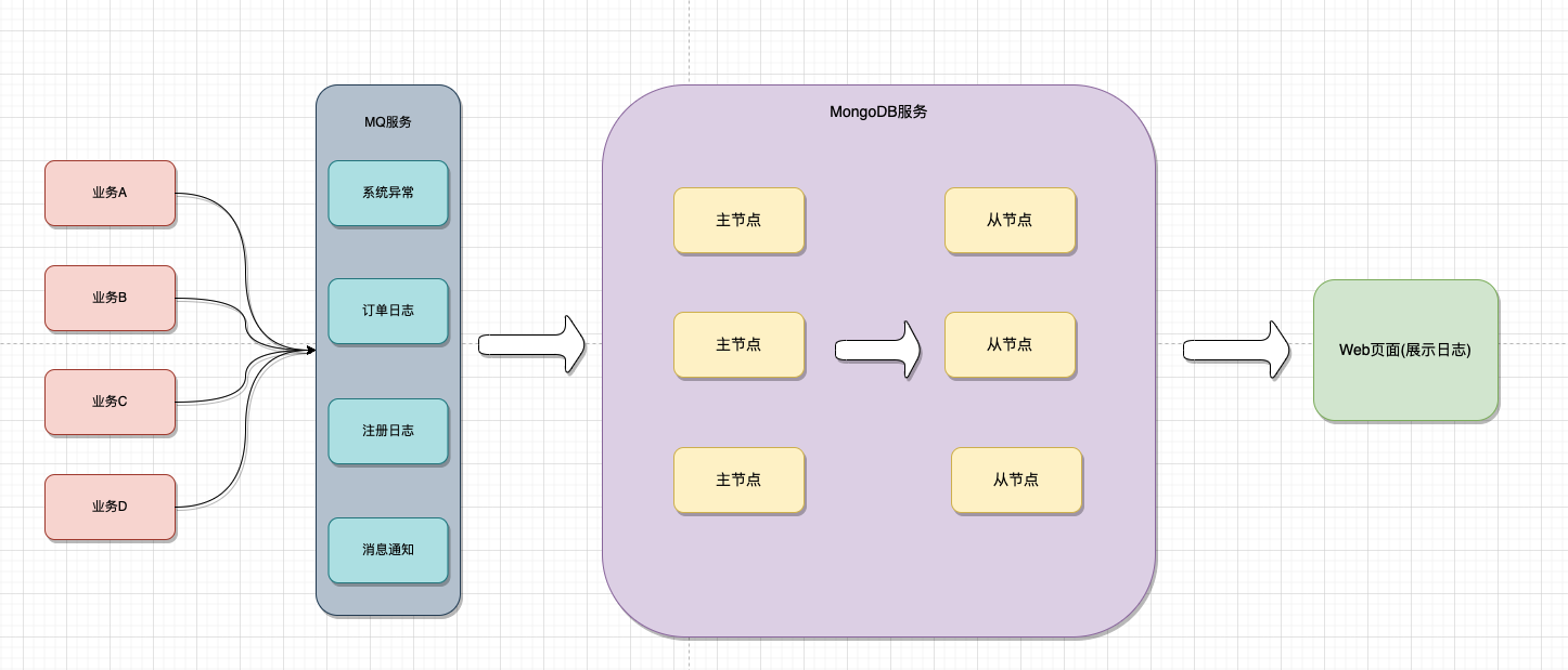 - MQ服务,则是作为日志队列,临时存储日志消息。这样是为了提高日志的处理能力。在高并发的业务场景中,如果实时的将日志写入到MongoDB中,这样难免会降低业务处理的速度。