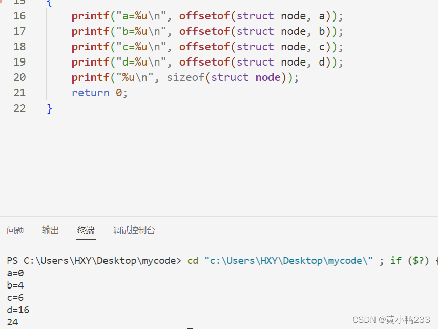struct node{int a;short b;char c[5];double d;}show offsetof