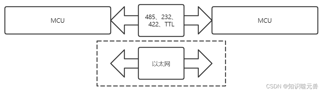然而MCU跟MCU之间的通信,还需要借助一些外围电路来实现,以匹配不同的应用环境。最简单的是TTL,两个MCU直连。如果需要长距离传输,则需要使用232、485、422这种。如果使用TCP,则需要有以太网相关电路。